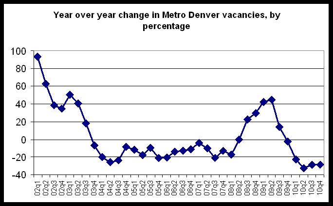 The second graph shows the year-over-year percentage changes in the vacancy rate in metro Denver. Note that the last five values are below zero. In other words, for the last five quarters in a row, the vacancy rate in metro Denver has been lower than it was one year earlier. It was apparently not unusual to have a negative year-over-year change in the vacancy rate between 2003 and 2007, it is significant that the year over year changes during the last four quarters have all been down by 20 percent or more. The magnitude of these year-over-year changes in vacancy rates has not been seen on a metro-wide level at any other time during the last ten years.