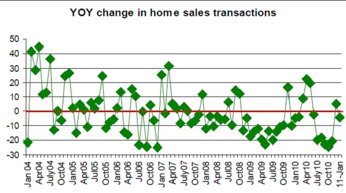 Nevertheless, as we can see in the third graph, January's 4.5 percent decline is a bit of an improvement (from the seller's perspective) compared to the second half of 2010, when monthly year-over-year declines were often down by 20 percent or more. Seven of the last eight months showed a decline in single-family home sales transactions when compared to the previous year.