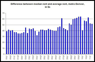 Interestingly, we can see in last graph that the difference between the median rent and the average rent has grown in recent quarters. Between 2000 and 2007, the difference between median and average rents was 45 dollars or less. Since 2007, the difference has usually exceeded 50 dollars. This suggests that a relatively small number of units (compared to the overall stock of rental units) are experiencing some significant rent growth while the majority of units are experiencing much less growth. (For more on the relationship between average and median rents, see here.)