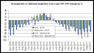In June 2011, the HPI was down 7.16 YOY in attached single family units in metro Denver, and the HPI was down 6.88 percent statewide. By contrast, all SF units, including detached units, was down only 1.5 percent in metro Denver, and it was down 3.14 percent statewide.