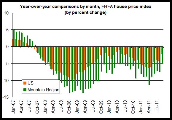 We can note that the Mountain region has performed more poorly (from a seller's perspective) than the national index. This runs contrary to some local experience and some statistics. The Case-Shiller data for the Denver metro area, for example shows that local prices did not decline as much as the national composite index following the financial panic in 2008. Also, the FHFA "expanded-data" index shows Colorado performing better than the national index.