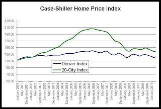 Generally speaking, personal income has been largely flat in Colorado since 2008 reflecting a sluggish job market and wage growth. Income growth from wages and employment has been sluggish as is shown when transfer receipts are excluded from calculations. This makes sense given that May 2011 employment data showed Colorado's total employment totals falling by 6,100 jobs when compared year over year.