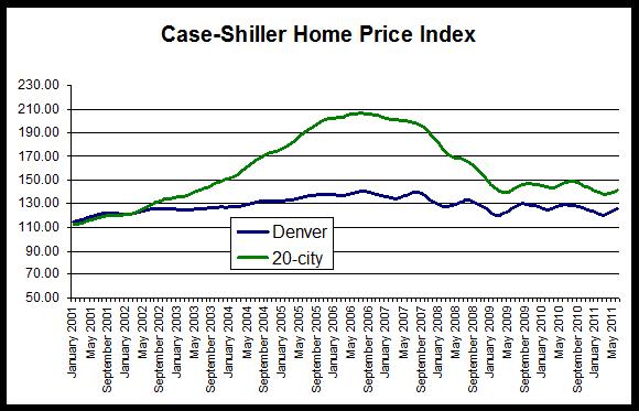 The 20-city composite is down 31.5 percent since it peaked in July 2006, but the Denver index is down only 10.2 percent from its August 2006 peak.