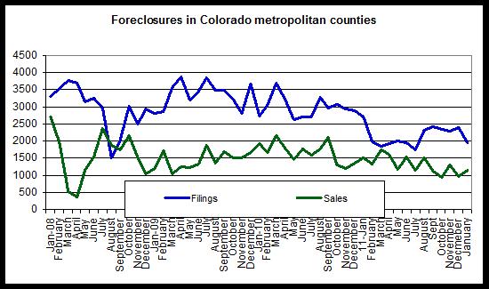 Both foreclosure filings and sales at auction in Colorado’s metro counties were down during January this year when compared to the same month last year. According to a report released Thursday by the Colorado Division of Housing, foreclosure auction sales in Colorado’s metropolitan counties were down 23.3 percent in January compared to January of last year, dropping from 1,499 to 1,150. January 2012’s sales total was the lowest January total reported in five years.