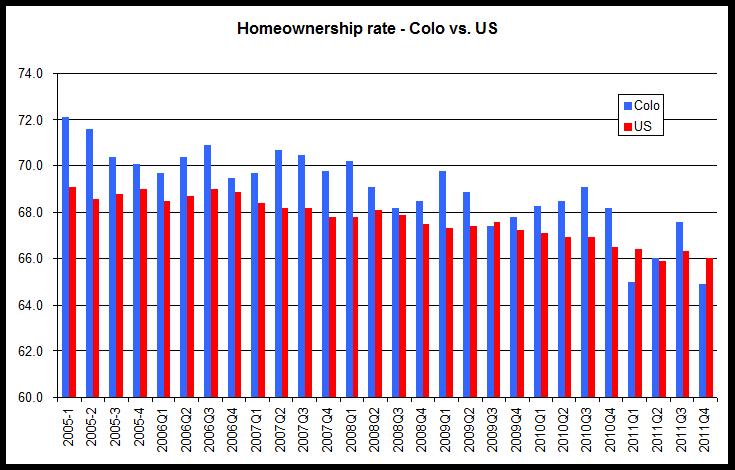According to data released on January 31 by the Census Bureau, the national homeownership rate declined from 66.5 percent during the 4th quarter of 2010 to 66.0 percent during the fourth quarter of 2011. During the same period, the homeownership rate in Colorado fell from 68.2 percent to 64.9 percent. In the Denver-Aurora area, the rate fell from 65.2 percent to 62.9 percent during the same period.