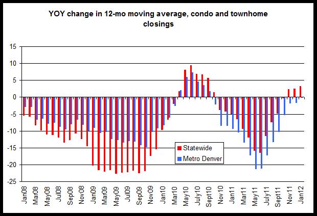 The second graph shows year-over-year changes in the 12-month condo and townhome sales average. We see increases during 2010 following the end of the homebuyer tax credit period. The year-over-year changes moved back into negative territory by early 2011, and the year-over-year change in the moving average in metro Denver has remained negative for the past sixteen months. Statewide, the year-over-year change has turned positive since November 2011. The magnitude of the the decline for each month has lessened in metro Denver over the past eight months.
