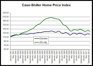 Case-Shiller released its home price index for November today. The home price index for the Denver area fell 0.5 percent from October to November, and fell 0.2 percent,year over year, from November 2010 to November 2011. Prices fell in November due at least partially to seasonal factors, although the overall index for the year remains below the index values seen during 2010. The first graph shows the index values since 2001: