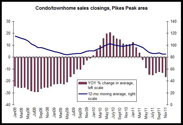 Condo and townhome sales in metro Denver and statewide increased, year over year, for the fifth month in a row in November. According to condo and townhome sales data released by the Colorado Association of Realtors, sales increased statewide 2.3 percent in November 2011 from the same month a year earlier. They increased 3.6 percent in metro Denver over the same period. In the Pikes Peak region, on the other hand, November sales decreased 30.9 percent. In November, there were 924 sales statewide. 600 of them were in metro Denver and 67 were in the Pikes Peak region.