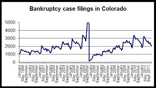 Bankruptcy filings in Colorado fell 7.7 percent in Colorado, falling from 32,509 during 2010 to 29,994 filings during 2011. According to new bankruptcy filing data, released yesterday by the U.S. District Court, from 2009 to 2010, filings increased 16 percent. 2011's bankruptcy total is the lowest annual total recorded since 2009 when filings totaled 27,997. 2011 also showed the largest annual drop since 2006.