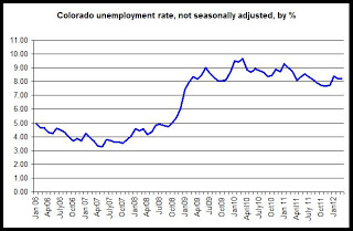 In Colorado's metro areas, all areas except the Fort Collins metro area showed year-over-declines from February 2012 to February 2012. Grand Junction and Pueblo showed the largest drops while Boulder and Denver metro showed the smallest drops.
