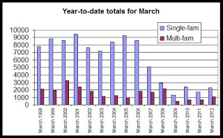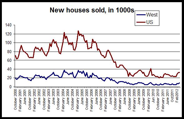At 9,000 new home sales during April, sales are up from March 2012's total of 7,000, but were down from April 2010's total of 10,000. This suggests a continued lack of robust demand for new homes.